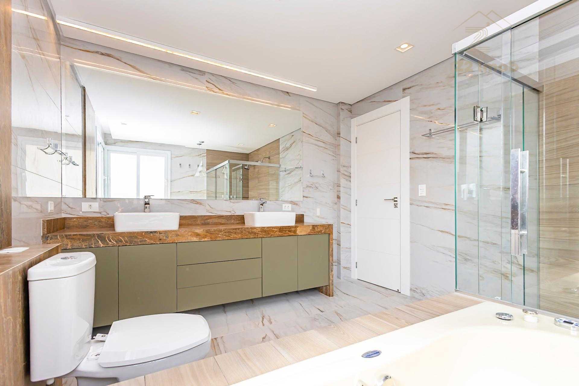 Suíte master com 2 chuveiros, 2 cubas e banheira hidro.
