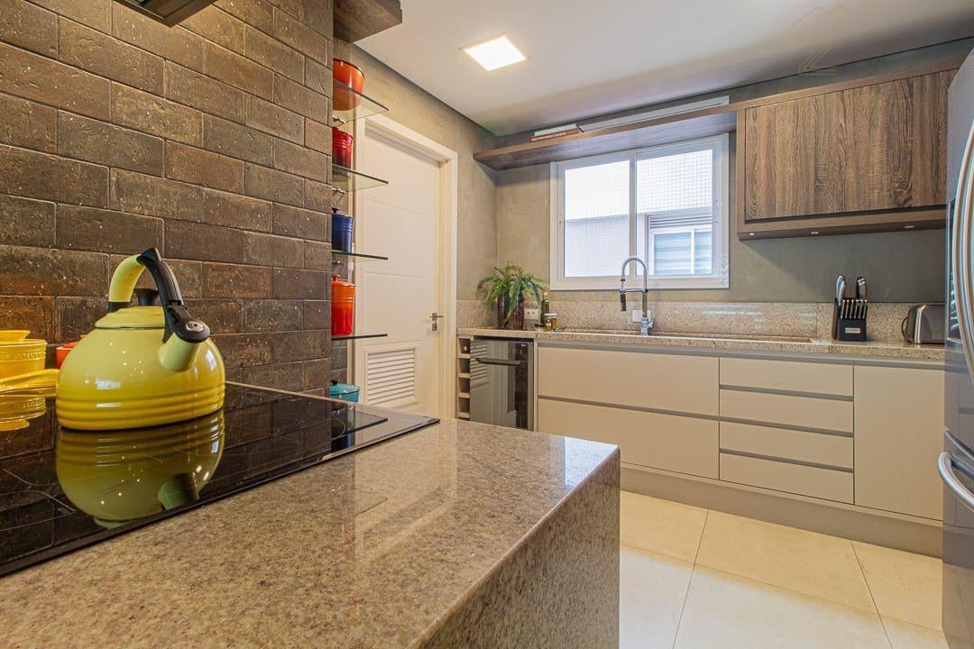 Churrasqueira a carvão com bancada em granito e armários planejados;