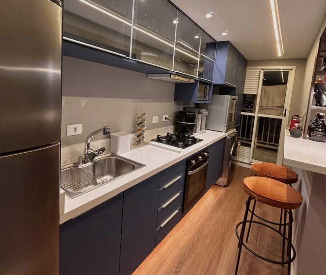 A cozinha planejada estilo gourmet possui excelente aproveitamento de espaço, bancada tipo bar, armários sob medida e lavanderia integrada.