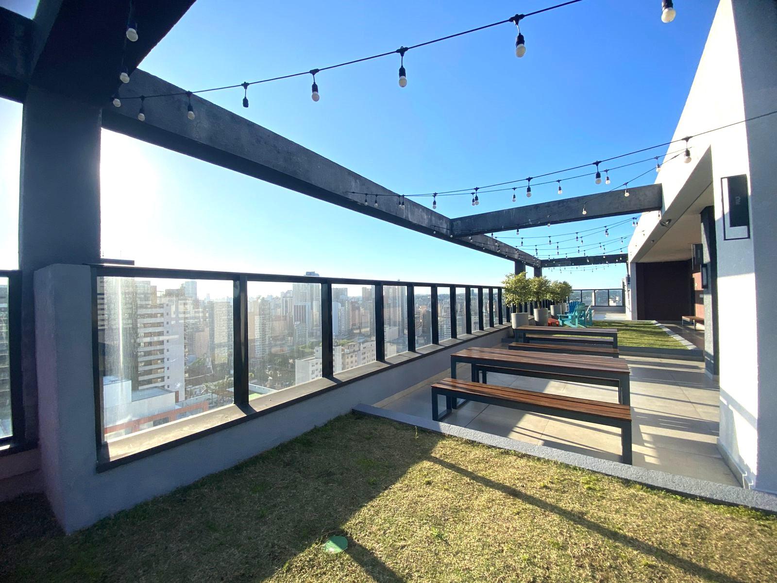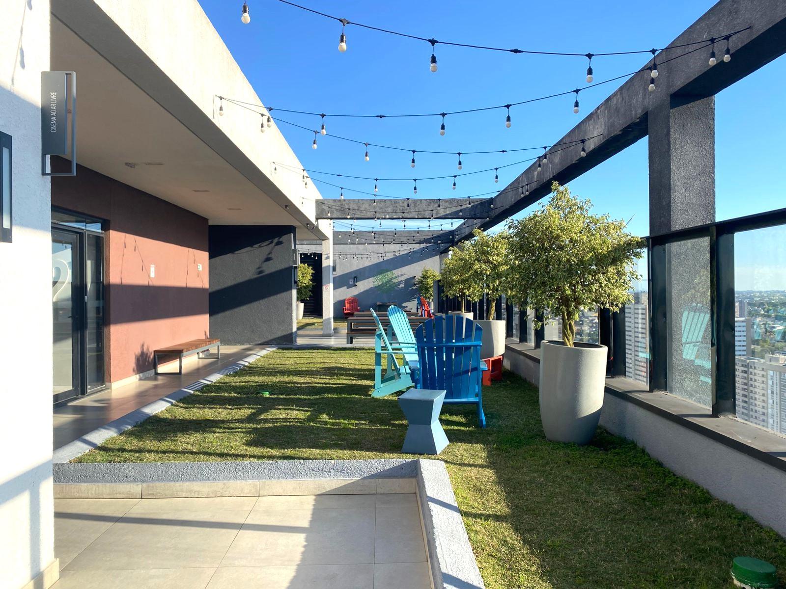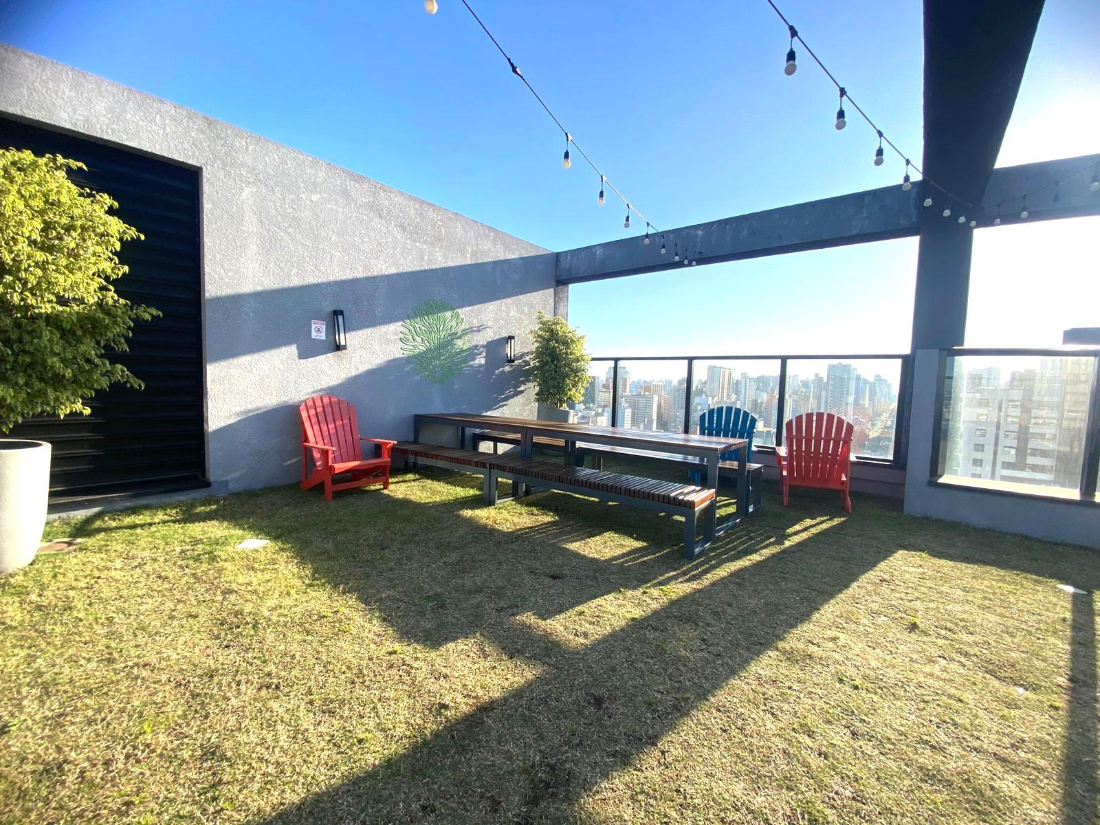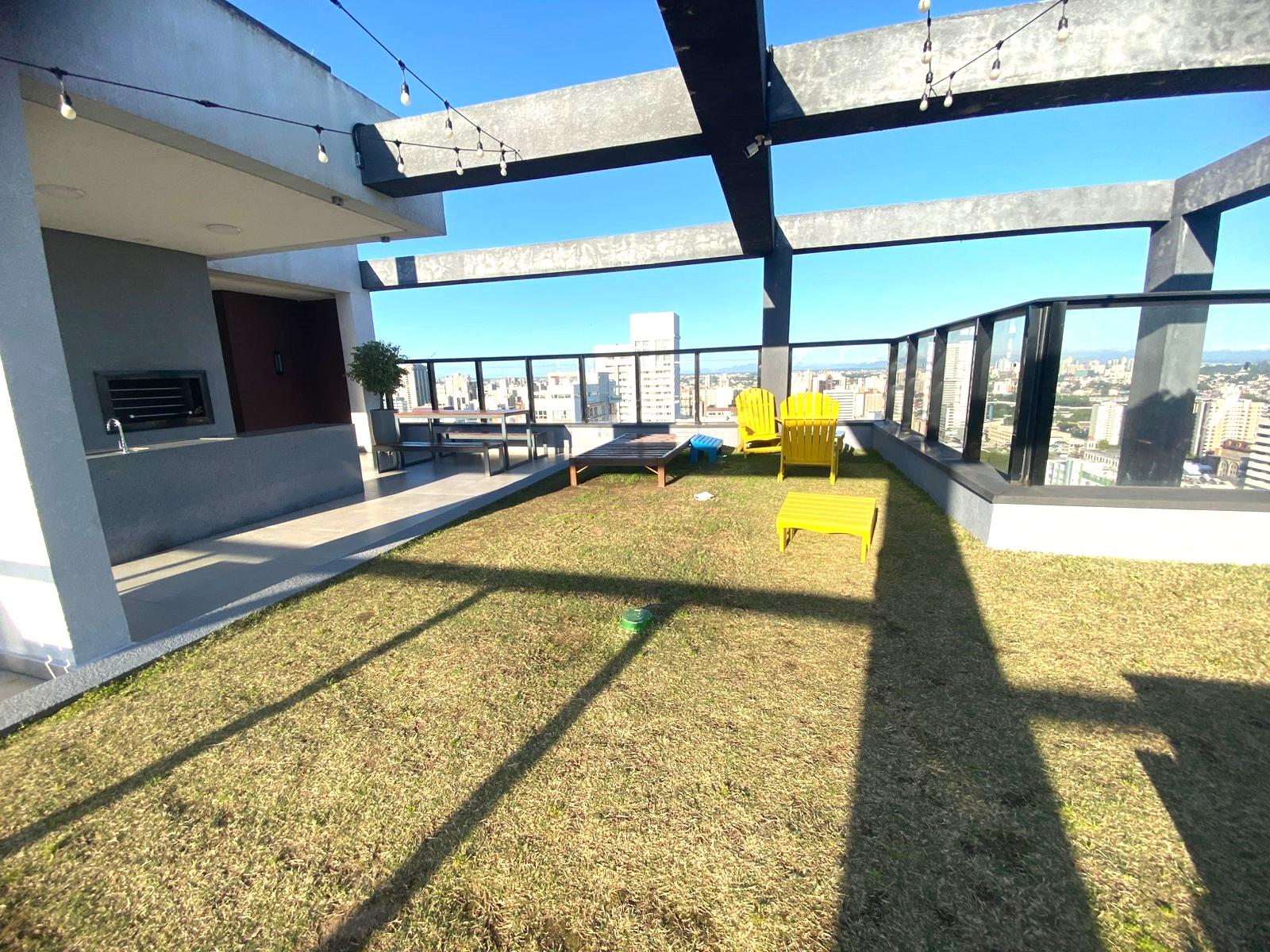 Roof top com churrasqueira, cadeiras pra aproveitar o sol e grama natural