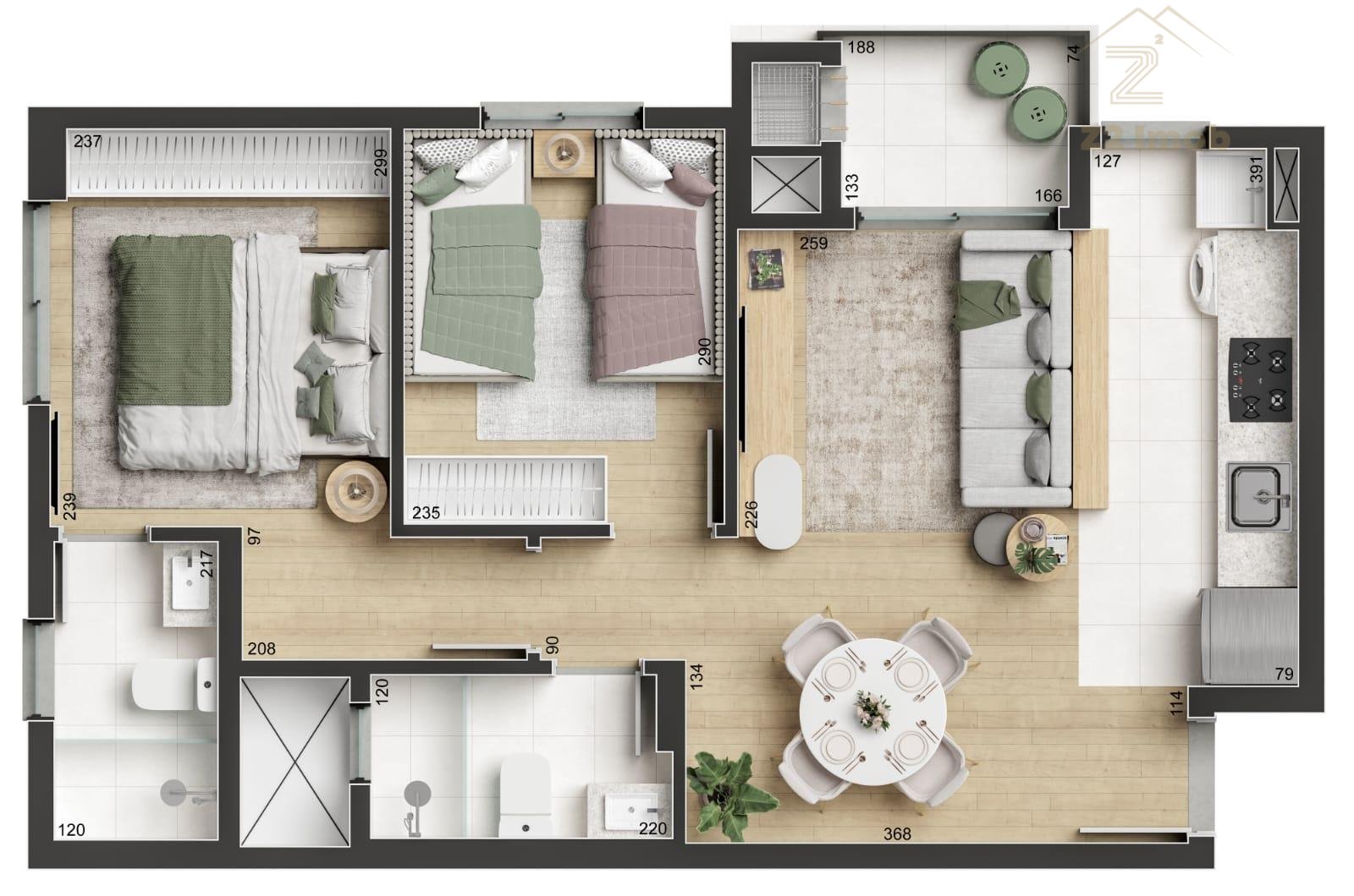 2 dormitórios, sendo 1 suíte, ideal para família ou quem busca mais privacidade.