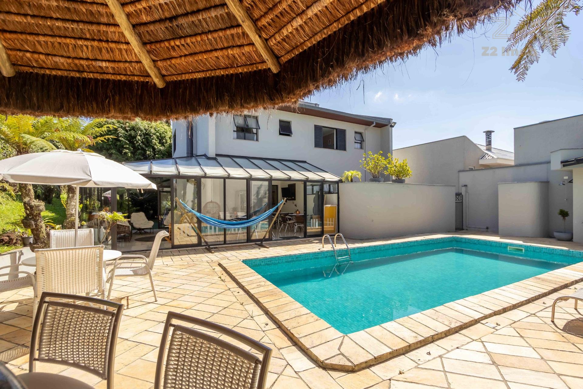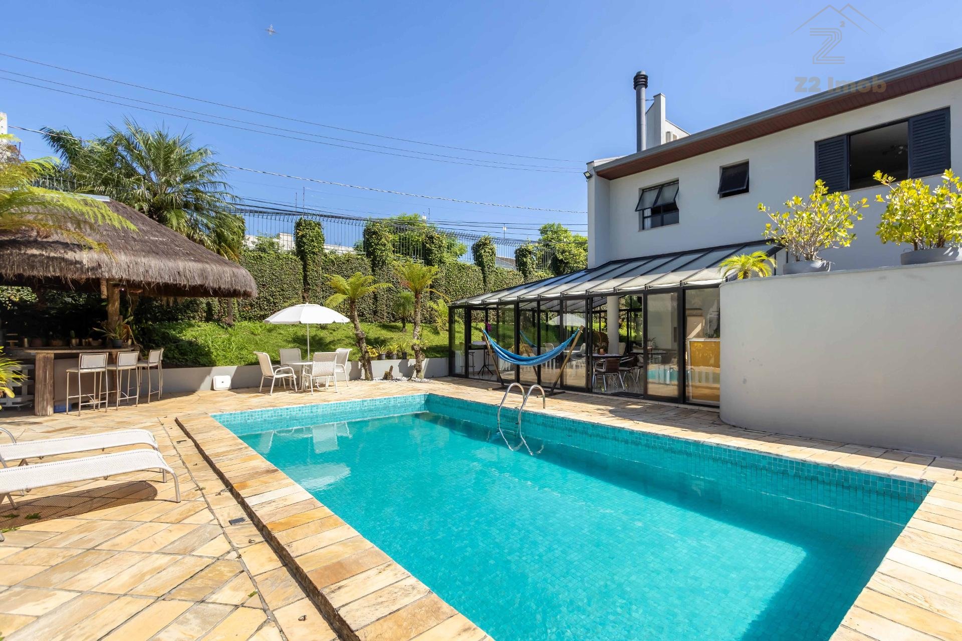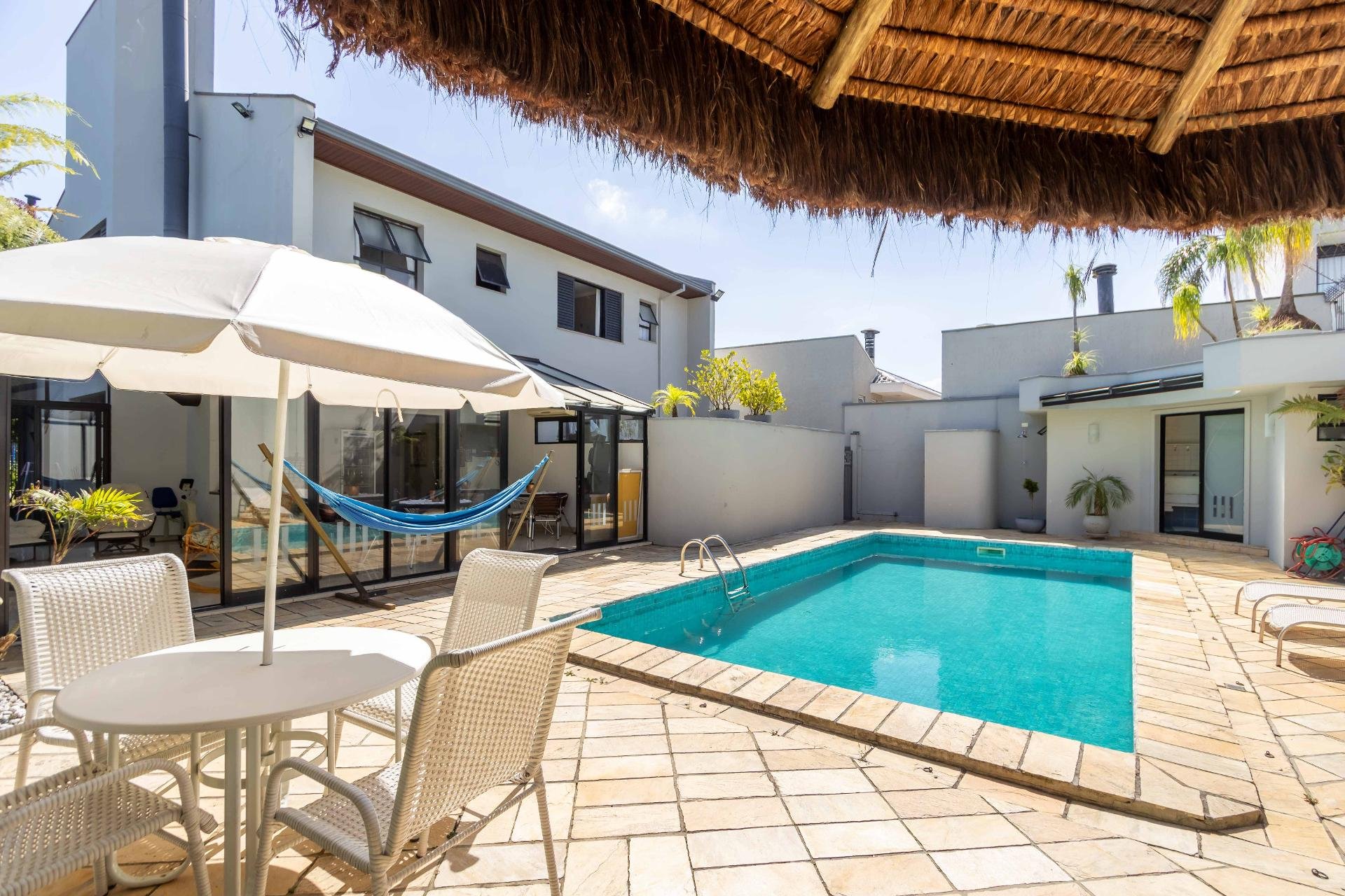 A residência conta ainda com 5 banheiros, 4 vagas de garagem, vestiário completo com chuveiro para atender com praticidade momentos de lazer e piscina, além de acabamentos de altíssimo padrão incluindo pisos de porcelanato premium, esquadrias amplas e infraestrutura pronta para climatização e automação residencial.