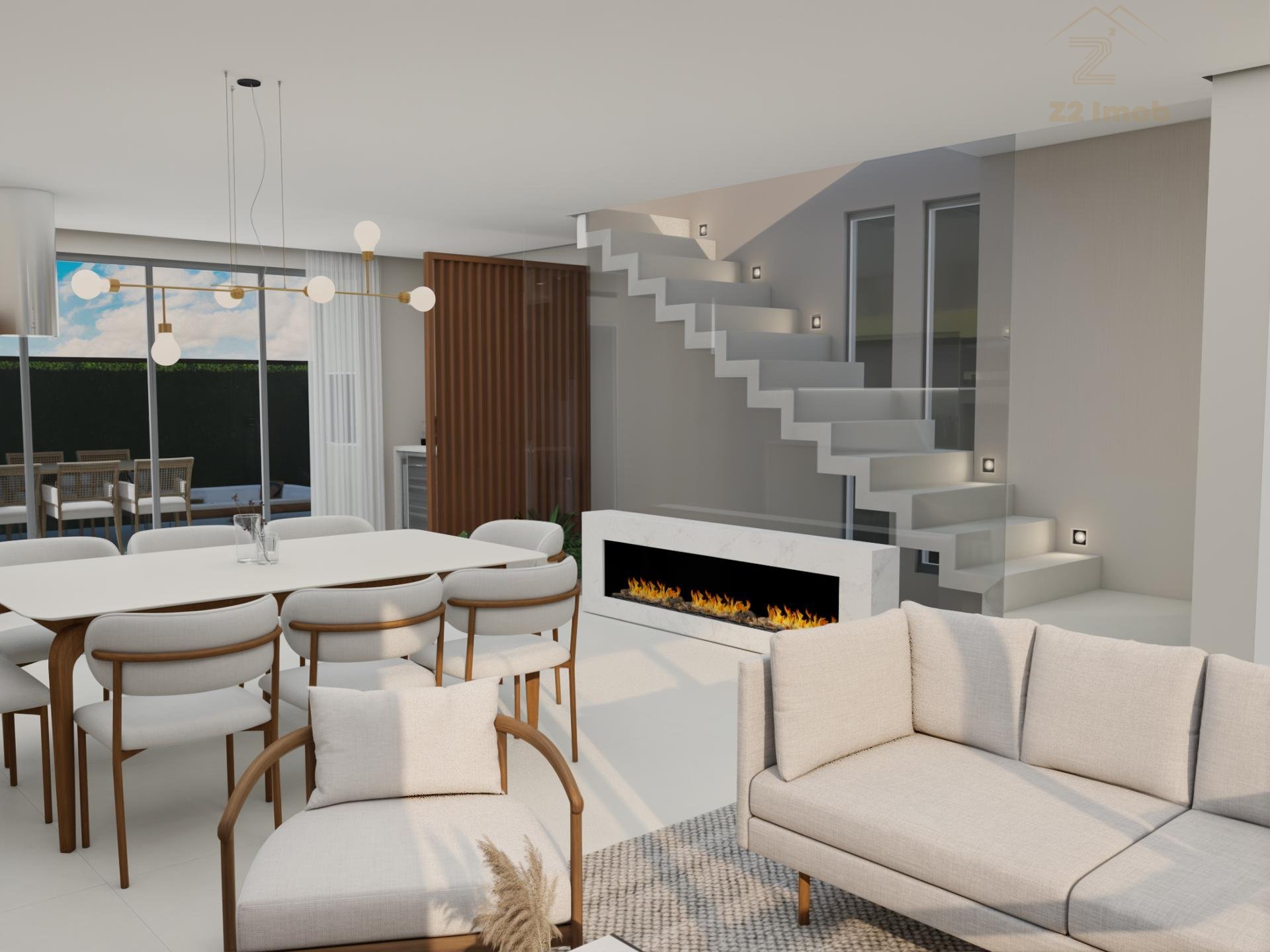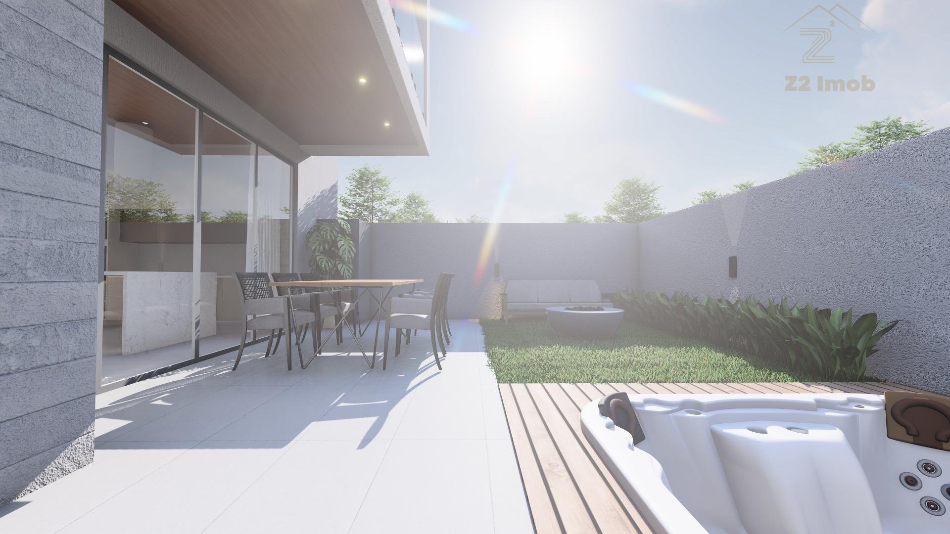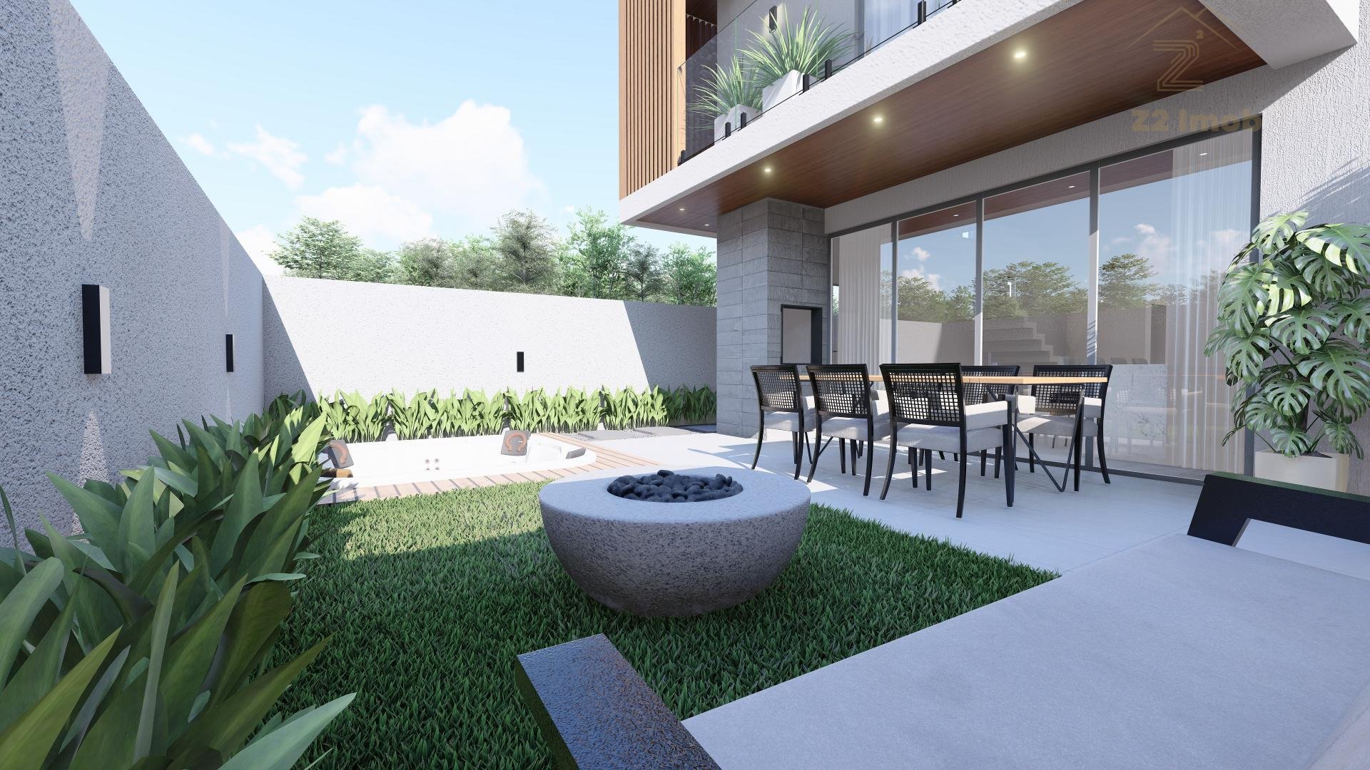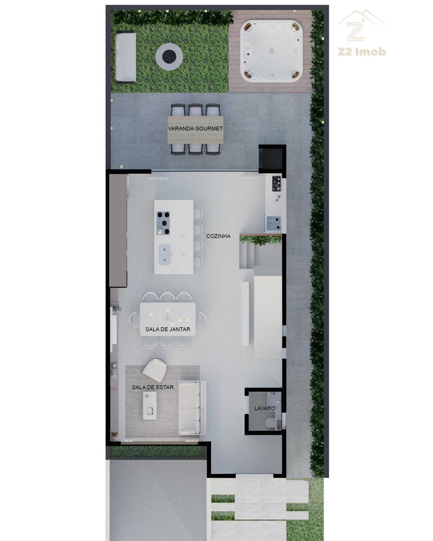 Terreo com sala de estar, integrada com jantar, espaço adega, lavabo e cozinha com varanda gourmet, churrasqueira a carvao, e um amplo quintal com espaço para jacuzzi e grama.