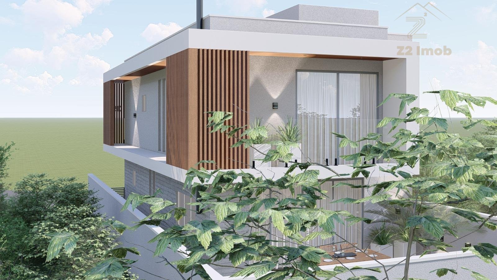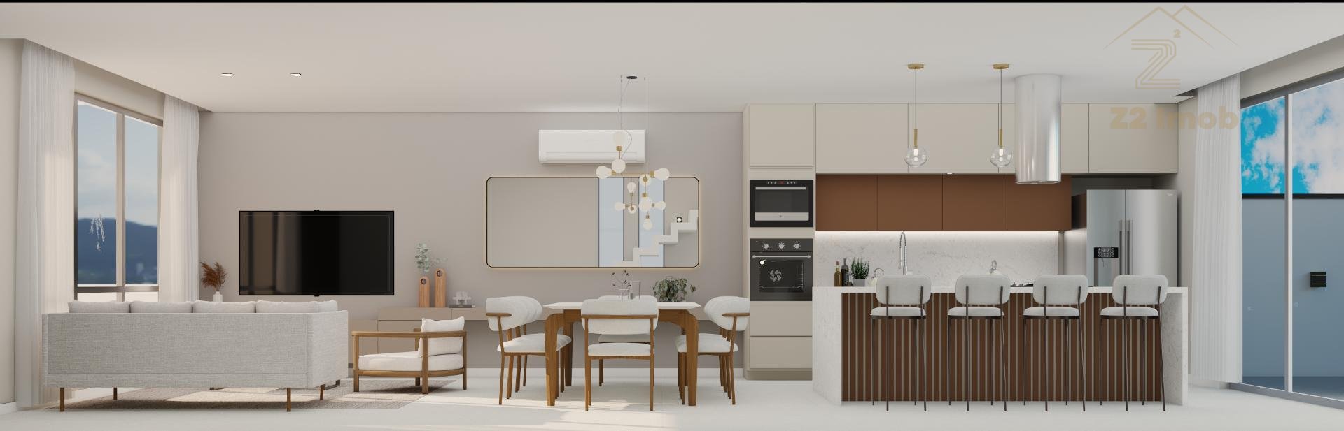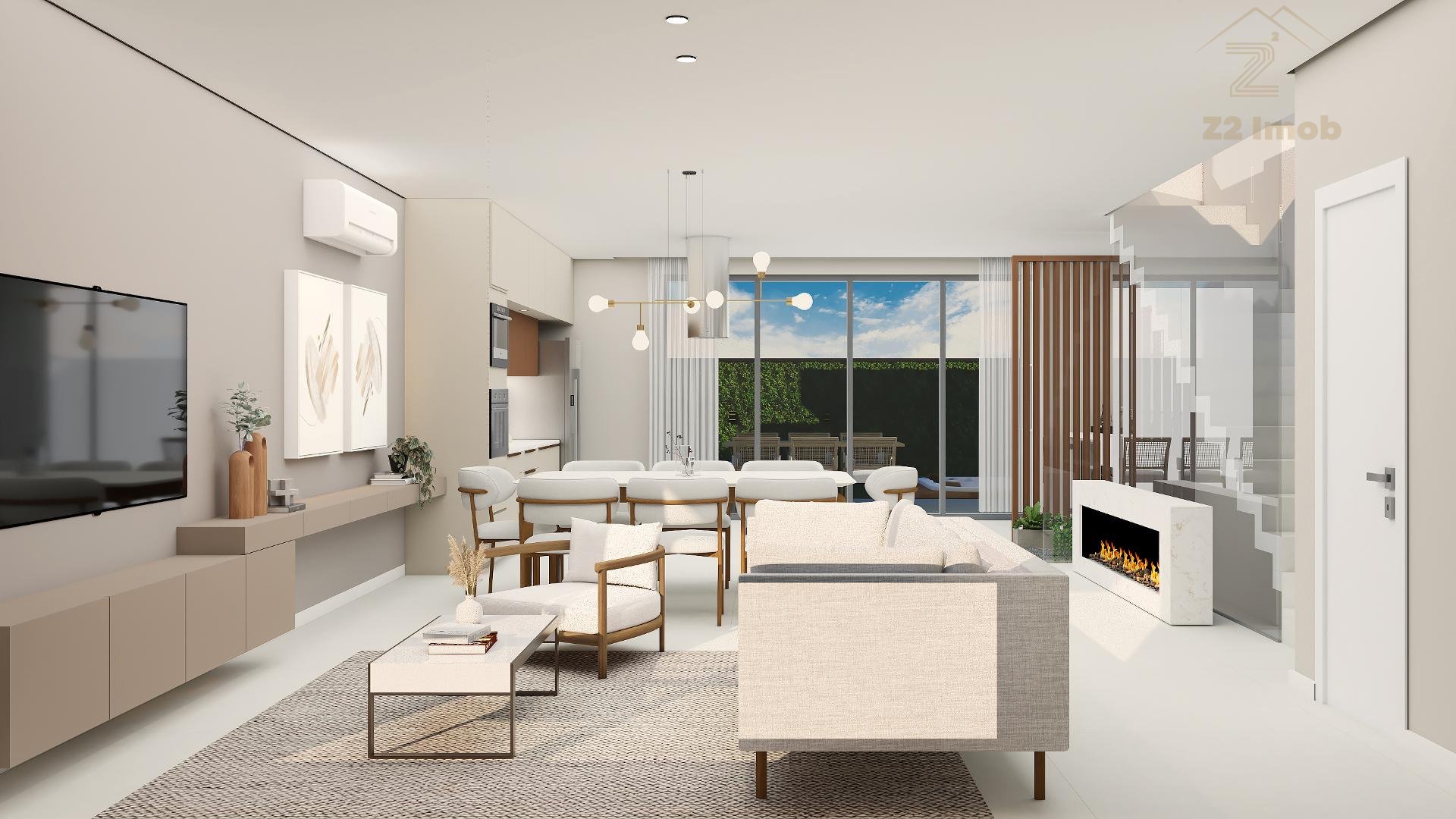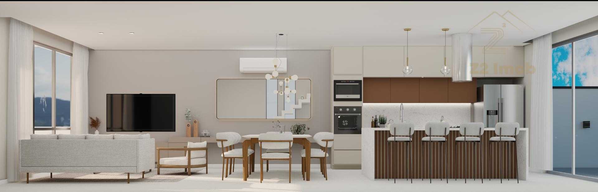 Terreo com sala de estar, integrada com jantar, espaço adega, lavabo e cozinha com varanda gourmet, churrasqueira a carvao, e um amplo quintal com espaço para jacuzzi e grama.
