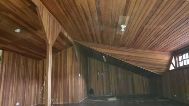 Sótão com revestimento em madeira, proporcionando um ambiente exclusivo e vista privilegiada para a avenida