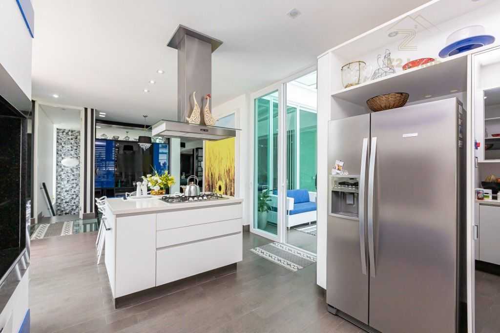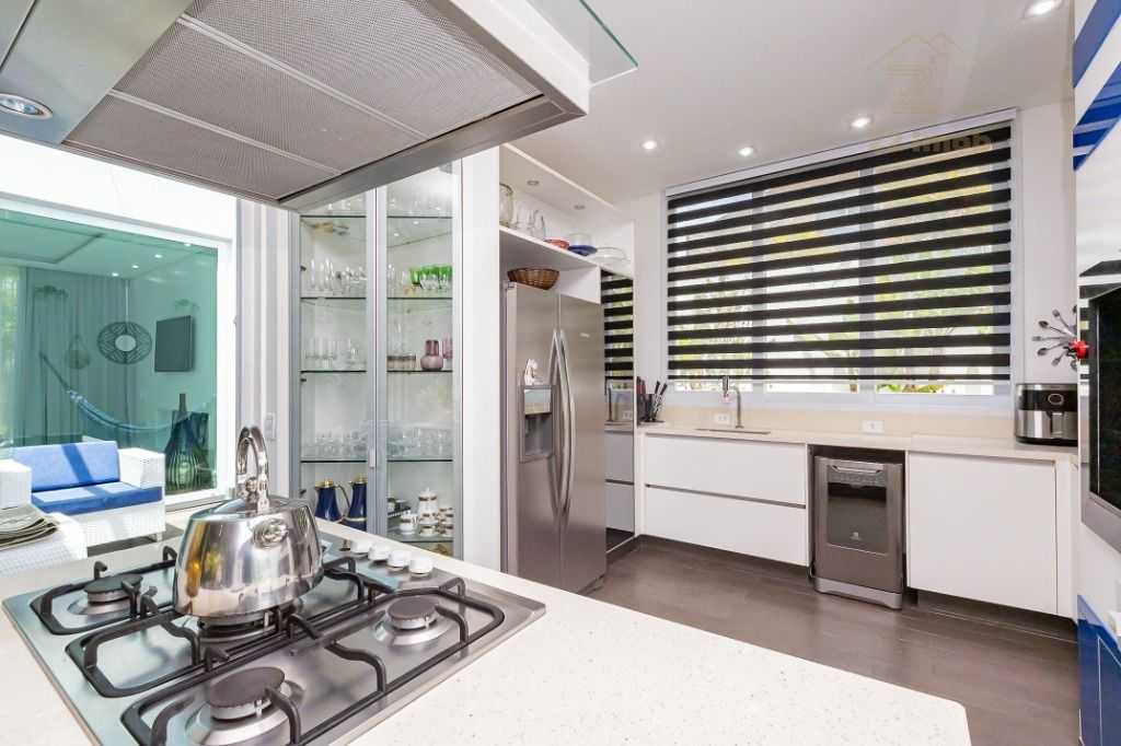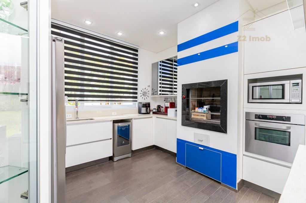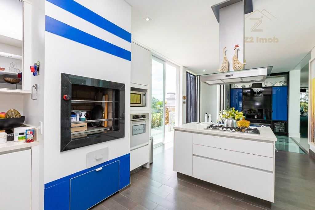 - Cozinha moderna com ilha gourmet, churrasqueira e espaço para copa