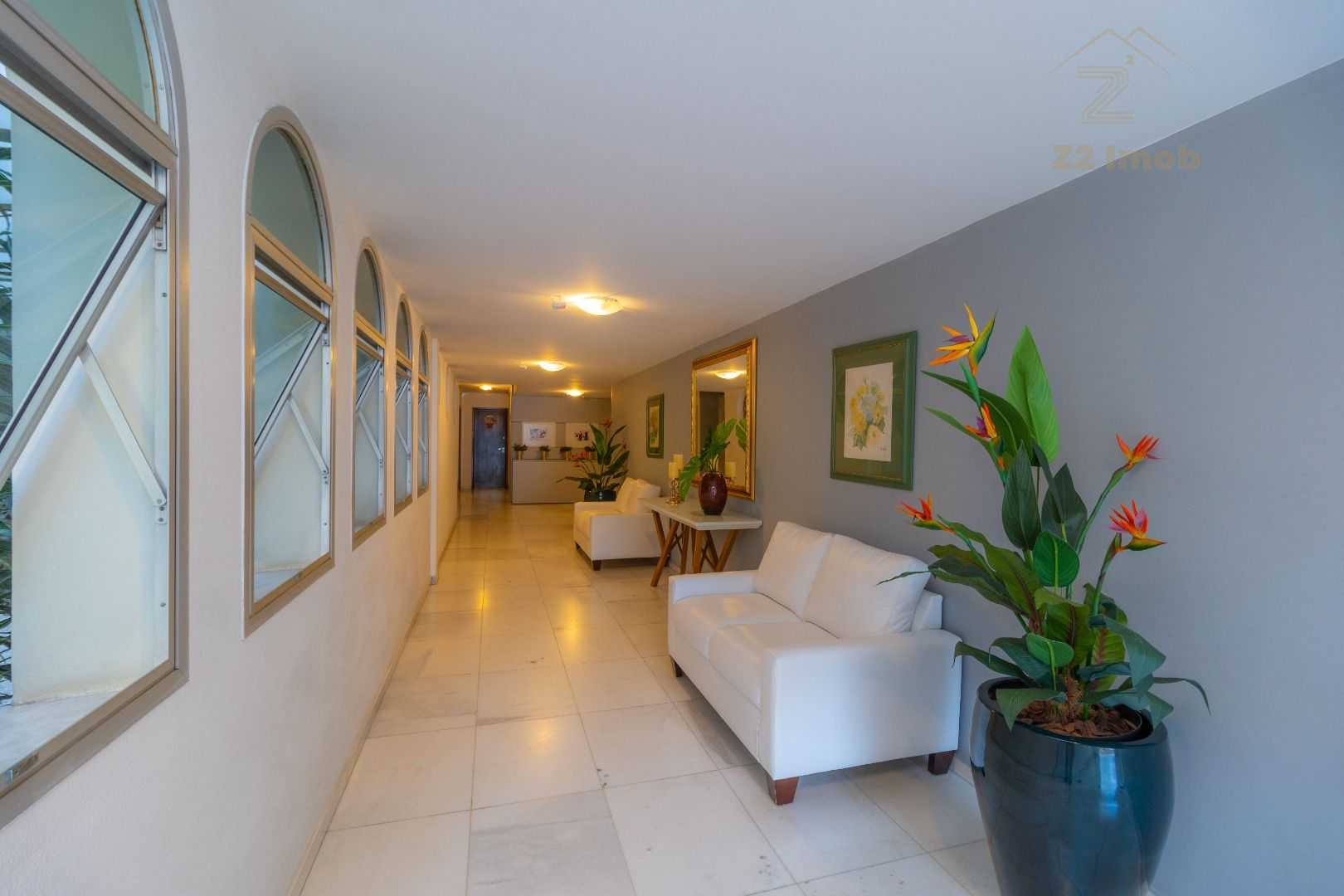 Salão de festas e jardim no piso térreo, com hall de entrada em mármore branco.