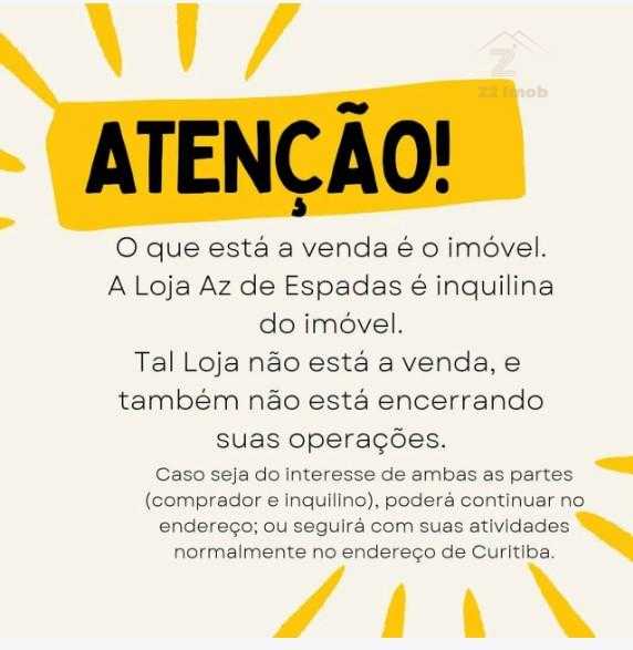 ATENÇÃO: A Loja que funciona ali é apenas inquilina do imóvel. Não é proprietária. Tampouco está encerrando suas atividades. Caso seja do interesse de ambas as partes (comprador e inquilino), tal Loja pode seguir atuando no local. Caso contrário seguirá suas atividades em seu endereço de Curitiba, ou em outro imóvel em São José dos Pinhais.
