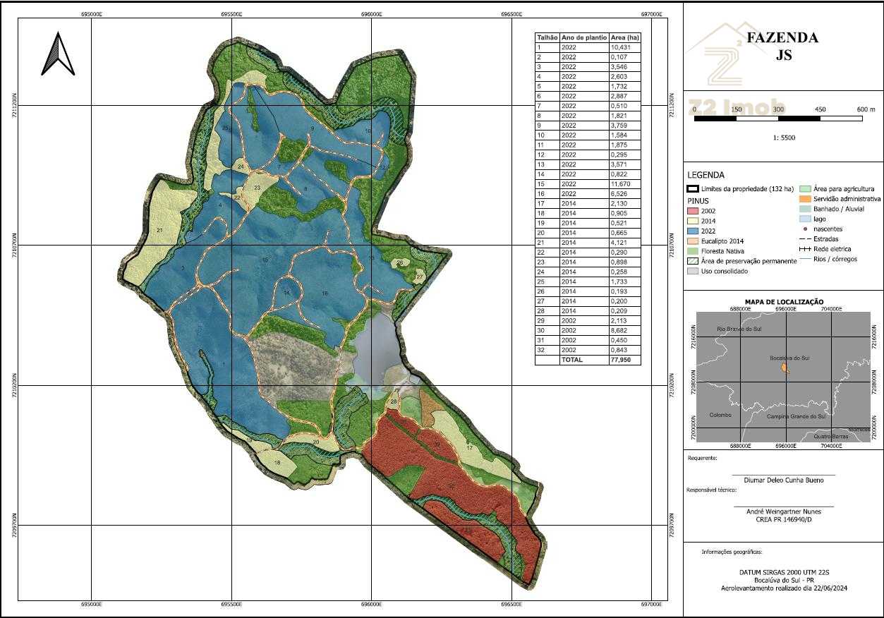 Madeira de Pinus Incluída: O comprador terá à disposição R$ 2 milhões em madeira de pinus, uma área de 77,95 hectares (conforme zoneamento), garantindo um retorno financeiro imediato.