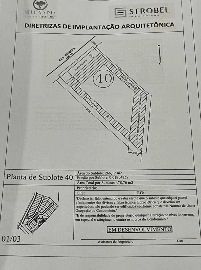 Condomínio Sierra Vista - Bairro Atuba, lote 40, com área total de 478,6 m² e área de sublote de 266,12 m²e, localização interna diferenciada. ENTREGA PREVISTA PARA DEZ/23Um Condomínio Parque para 46 famílias, implantado em uma antiga pedreira de rara beleza natural, valorizando a vegetação nativa e a vista para a Serra do Mar.O empreendimento foi concebido com áreas de convivência e lazer diferenciadas, explorando as características únicas da topografia.O Grill próximo a quadra poliesportiva é informal, o Sports Bar é o espaço ideal para o happy hour e o Salão de Festas com a sua praça externa, o local ideal para as comemorações com amigos e família.Além dos espaços ao ar livre, como a pracinha com lareira junto a um paredão de pedra, a trilha que passa pelo pomar, o playground , o lago com sua ponte e o lounge externo ideais para momentos de diversão e o contato com a natureza. Os moradores ainda contam com a academia com vista panorâmica .O condomínio fica ao lado do Parque da Pedreira , próximo a linha verde e a poucos minutos do centro de Curitiba. Invista no lazer e segurança de sua família, venha conhecer.# Valor sujeito a alteração sem aviso prévio.